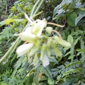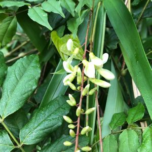 これもホテルの庭に咲いていました 白い色が木の陰で、目立ってぽつりと咲いていました♡ ちょっと遠くて、手を伸ばすのがやっとで葉っぱが撮れませんでした(>.<)🌱 8月7日 名前を教えてください 藤ですか? ナツフジ(夏藤)別名 ドヨウフジ(土用藤)と多分思います。 教えて頂きました。 ありがとうございます🎀😊❤️