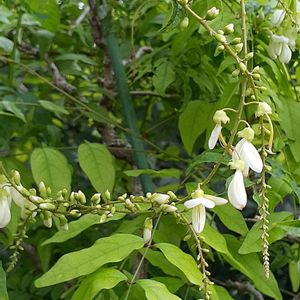 ナ ツ フ ジ (夏藤) 別(異)名:ドヨウフジ(土用藤) マメ科のつる性落葉木本です。 日本🇯🇵固有種で、関東地方南部以西に分布しています。 つるは左巻きで細く、葉は奇数羽状複葉でほとんど無毛です。葉柄の付け根に托葉があります。 時としてフジ(藤)の芽生えと見間違えられる事もありますが、ナツフジはあまり太くならず、高木にもなりません。あまり目立たず、夏の暑い盛りに他の木に紛れてヒッソリと咲いている、奥ゆかしい植物です。