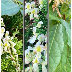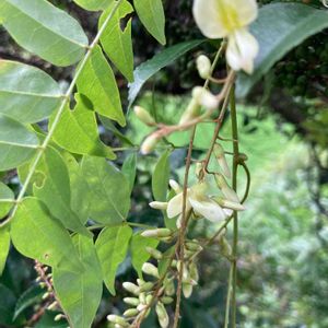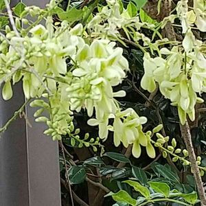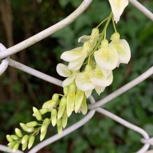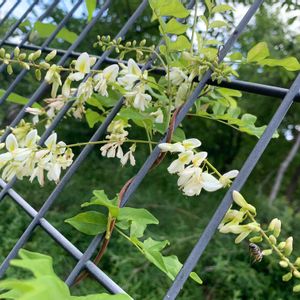 ナツフジ フェンスに絡んでいるナツフジです。 少し緑がかった白い花がスッキリ、涼しげ…🎐 樹木や草むらの緑の中ばかり見ていたので新鮮✨ ツルの巻き上がり(左巻き・S字巻)がわかりやすいです🤗 マメ科ナツフジ属