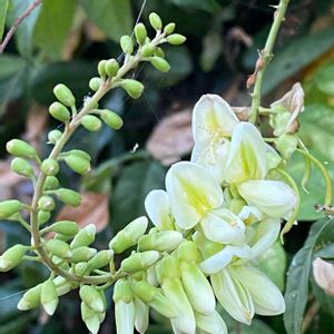 里山散歩1 これはどうしたことでしょうか? ナツフジの花房が板状に広がり 先端は3つに別れ途中はつぼみがびっしりついています。🤔