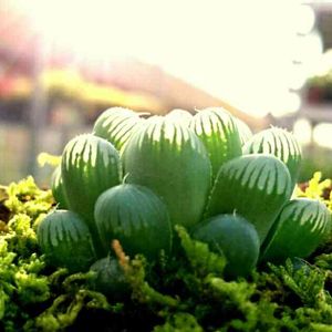 ハウォルチア オブツーサ スコリア鉢に入れてみました♪以外と似合う!? 夕日が透けてキレイです