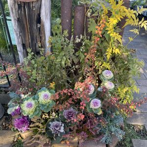 おはようございます 今朝は雨上がり薄日がさしています 1枚目 昨日お持ち帰りしたこちらパンジーミニ(ビオラかと思いました)と葉牡丹3種の寄せ植え🪴 全部同系色💜💚😂 何か足したいような… 2枚目ベランダの多肉達 紅葉してきましたね🍁 最後は我が家の玄関前の棚のお花達 💛💚💜🌸🪴