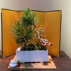 こんにちは〜 今日のお花 マツ 盆栽教室での作品です 黒松 10月に初めてマツを手にして葉透かしをして11月に針金かけでしたが小さいわりには今年のマツは太く素人が針金をかけると折れる心配があるとのことで針金かけ無しで植え込みました 南天とユキノシタも植えました🪴 お教室の床の間をお借りして屏風とお正月飾りも一緒に… 如何でしょうか😂