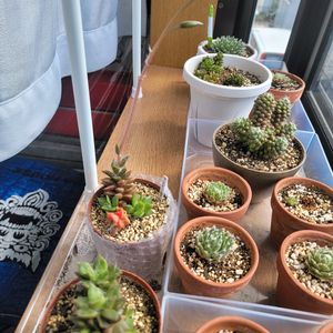 おはようございます。 アナカンプセロス属 アラクノイデス 桜吹雪にも感じが似てるし、モケモケと糸みたいなのが生えてるとこは茶傘にも似てます。😆 暑すぎ、寒すぎの時期は休眠するみたいです。 なので今は成長期🙌 大きくなって欲しいな。😙