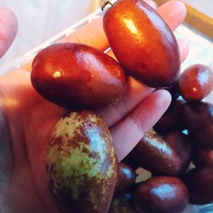 これは取り寄せたなつめデス 日本では見たことのない形の大実 甘くてシャキシャキしてる~ 庭で育てたいなぁ~ 苗木どこかで売ってないかなぁ~ 一個単位平均16グラム 1番大きいもの22グラム 縦長5cm 横幅2.5~3cm 甘くハチミツに似たような風味がある。 熟した柔らかいやつは 日本ナツメよりも激甘い