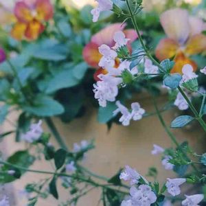 壁掛けプランターにシンプルに寄せ植えしました(*ˊᵕˋ*) 🍀クロデンドロム ブルーウイング 🍀カラミンサ・ネペタ 🍀PWスーパートレニア カタリーナ ピンクリバー トレニアが咲いてきたので1枚📸