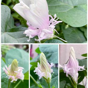 変わり咲き朝顔 ✽スプリットペタル✽ !!!Σ(゚ロ゚!(゚ペ?)???えっ コレ、あさがお〜?!ってビックリする位のお姿の朝顔ですo(。>ᴗ<。)o︎♬💗 2株植えて、picの右列、左列、咲き方がちょっと違いました。蕾の周りにも花びらっぽい物があり、花びらに切れこみが入り、裂けながら咲くものもあれば、1~2ヶ所だけ裂けて咲くものも。花の大きさは4cmくらいかな〜❁⃘*.゚ この朝顔は、ご近所の花友さんが種まきして苗をいただきました♡⃜ひゃ〜、珍しい面白いお花をありがとう(≧ω≦)💓💓