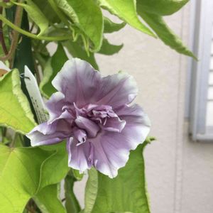 今日も朝顔 八重咲きの変異がよく見える個体 花びらに変化仕掛けている雄しべが、上の方に見えます。