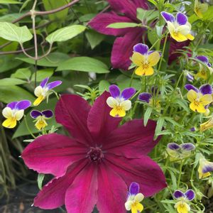 ①クレマチスとビオラ ②セイヨウオダマキ ③ルピナス ④⑤モミジ 新芽ですが陽が当たり 燃えているように見えました 🏷️真っ赤なな火曜日 参加します