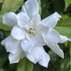 純白な梔子(くちなし)の花びらが,なんと美しいこと🤍 玄関前に咲き始めた、八重咲きの花は水も滴る美人さん 気が付かずに,水道のシャワーを浴びて涼しそう‼️