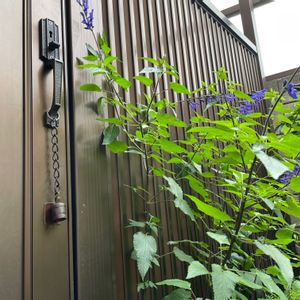 庭の扉にレトロ喫茶店の入口のような音がする銅ベルを取り付けました。扉に当たる部分は革を両面テープで貼り付けています。