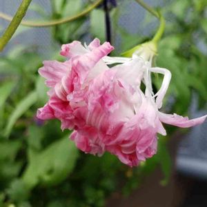 おはよう御座います😆🎶明け方から大雨が降り出して憂鬱だったけどカーテンの上を見てみると…もう上まで達した八重咲き朝顔スプリットペダルが行き場を無くし垂れ下がって咲いてました😆🎶来年は逆さ吊り栽培に挑戦してみようかなぁ…。