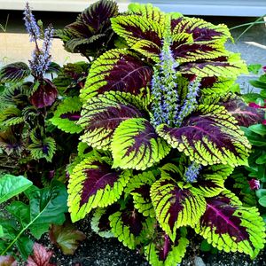 出勤途中の花壇に、大きなコリウスの葉に、お花が咲いていました。