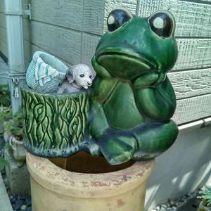 出勤途中で、通り道のお宅の花壇に、雨水タンクにワンちゃんと蛙さんが、☔まだかな❓と待っています。