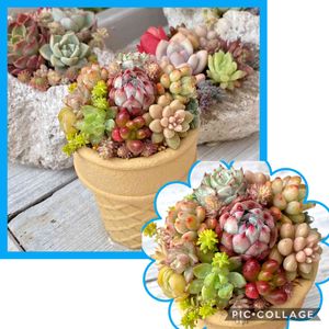 ソフトクリーム🍦コーンカップの鉢 私の行くセリアでは見かけた事がない💦 先日ネットショップのお店で偶然見つけて もう買うっきゃない👍 とポチりました❣️ 発根待ちだった子や 庭の子達を✂️したりの即席寄せ植えだけれど なんとか出来上がった💕