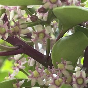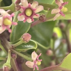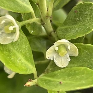 雌雄異株 これは雌株雌花 果実は9月頃から赤く熟す(球形) 果実は無味で食用にはならない。 花期は初夏ですか(3mm」〰︎ 今の時期 チラホラ咲いてます🎶 梅擬(うめもどき) モチノキ科