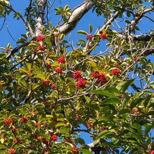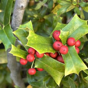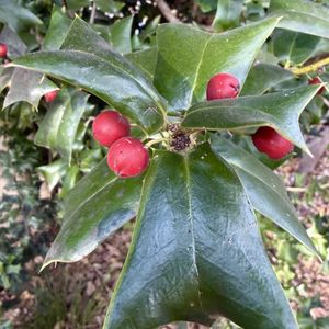 🎅セイヨウヒイラギ クリスマスに飾られます。常緑の葉、真っ赤な実は渋く鳥も食べないため魔除けに使われていたそうです。 ⚫︎モチノキ科 モチノキ属 ⚫︎原産 ヨーロッパ ⚫︎花期 4月〜6月 ⚫︎果期 11月〜2月