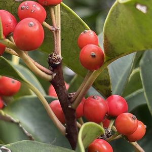 赤い果実いろいろ… ヤブコウジ(藪柑子)=十両:お庭より モチノキ(黐の木) シロダモ(白ダモ) ロウヤガキ(老爺柿) ナンテン(南天) ⚫︎⚪︎⚪︎⚪︎⚪︎