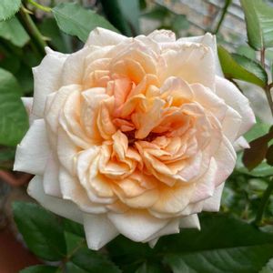 真夏のトロイメライさん。アプリコットな色味です! 今年はエドゥアールマネさんと一緒に誘引してましたが、エドゥアールマネさんの茂り方がすごく、埋もれた影響で誘引した枝は細り、その代わりに株元が日に当たったことでフェンスとは反対側の日の当たる方へ剛直なベーサルシュートが発生し、その先に咲かせたお花になります。花は上を向いて咲かせる感じなので、誘引せずに少し低めに切ってブッシュ仕立てにしたほうが良さそうですね。