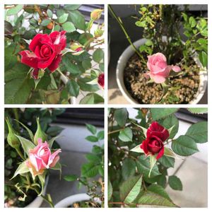 こんばんは🤗ミニ薔薇 開花しました。 ピンクの方は葉っぱが枯れてヤバいと思っていたけれどなんとか開花してくれました😂