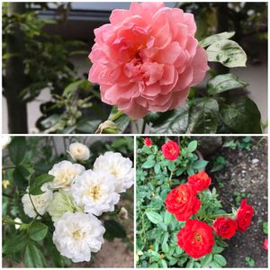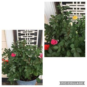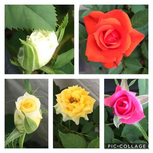 おはようございます。😀 ミニ薔薇 💖🧡💛ホワイト 咲いています。🌹🌹