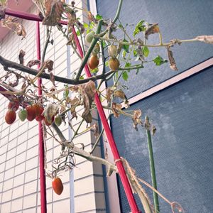 日除けをしてもうちのベランダは高温になるので ミニトマト苦しそうです😱🍂 夏に強いというポーチュラカたちは元気だからそういうことかなー トマトごめんよ、、、