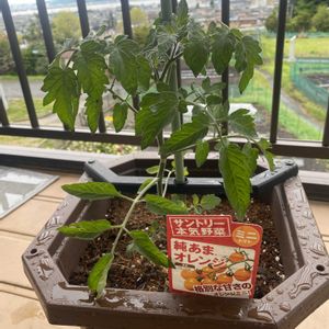 サントリーさんのミニトマト🍅純あまオレンジ😊 元気に成長中😁 一番花の蕾もついてる🌼.* 収穫が楽しみだ🤗 しっかりと管理するぞー٩(。•ω•。)و