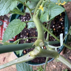 今朝のミニトマトの様子😱 植え付け半月、いつもより早めの植え付けで順調に第2花房まで育ってきてたのに、第1花房の根元でポキっと😰 脇芽も摘んだばかりでどうしたもんか😔