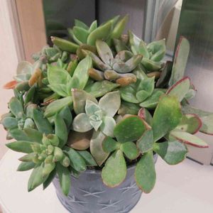 2月の寄植教室の作品。 1月は雪で中止になったので、2月は2つ作りました。 これは3月の公民館教室主催のお祭りで展示する作品。 苗は七福神以外は持ち寄りだったので、この冬耐え抜いた多肉ちゃんたちを大集合させました。 鉢は地元の作家さんにオーダーメイドしたのを皆で揃えたのだけれど、鉢が写ってないなぁ💦