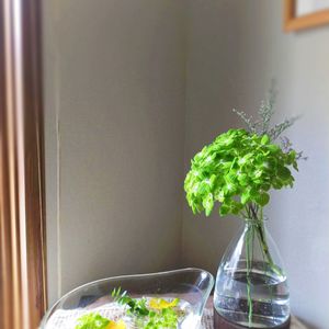 紫陽花💚 籠アレンジからガラスアレンジにシフト( ꈍᴗꈍ) 少し元気が無くなってきたので、切り分けてフローティングフラワーや一輪挿しで楽しもうと思います💠