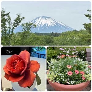 御殿場のお花達 🌸富士山 🗻 ヒヤシンス🪻 ☁️ 22℃/17℃ どんより曇り 蒸し蒸し なかなか気持ち良いお天気にならない毎日ですね。 𖧷 ①先日御殿場でのゴルフ場から見えた富士山🗻 天気予報では☁️のち☔️とはっきりしない予報がいい意味でハズレなんとか富士山が….現地の方曰く、 この時期は富士山がちゃんと見えることが少ないそうです。 レストランのテーブルの上の薔薇🌹 10㌢以上の大輪 御殿場アウトレットでの寄せ植え ② ホテルのロビーの花 芍薬? 本当に見事で素敵でした。 別のホテルのロビーにはスモークツリーの花が柔らかく…. ③ 今年の初めに水耕栽培で開花して、終わってから土に埋めておいたら、最近になってまた開花しました。 葉っぱはだいぶ枯れているんだけど….小さなお花が咲きました。