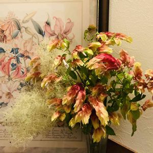 こんばんは😃🌃 一つ前にupしたお花の花材を持って帰ってきて生けました。 最初は新風体にしようかと思っていましたが、テッセンの茎は蔓なので上手く上段まで持ってこれそうになかったから自由花にしました。 ケムリソウを雲に見立てるのは同じで、私は水面に映った雲とヒマワリ☁️🌻 そして水面に浮かんでいるお花をテッセンで表現してみました。 花弁が8枚だったらテッセンで、6枚だったらクレマチスだとどこかで聞いたけど本当かな?(逆かも?)