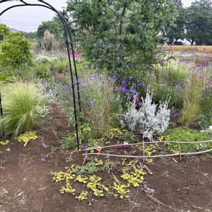 🌸トトちゃんもお花畑🌸 少しずつ進めてます🐌🐌現在進行中です💖💖 ①一昨日アーチの横の柵を作りました🤗🎵🎵ちょっと曲がってますが😅 ②こちらはアーチの左側。 ③先日買った苗を、植え付けましたよ🌸一緒に、千日紅の発芽した小さな苗も、植えてあります🌸 ④こちらはスモークツリー背丈が3メートルになってしまい樹形が乱れたので切りました。その枝が、今回の柵になりました❣️🎵🎵 廃材利用でした✨✨