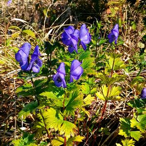 イブキトリカブト(伊吹鳥兜) キンポウゲ科トリカブト属の多年草 深い紫色の花は、どこに咲いていても、目立っていました。 花弁に見える部分は、萼片で、 上部の兜と側部、下部を作って、 花弁は、兜の中に隠されているそうです。 雄しべだけが、チラッと見えます。 花は、上から咲くようで、 茎頂部の花は終わり、種子がパンパンに詰まったサヤマメのような実がついていました。 日当たりのいい草原では、草丈が低く、真っ直ぐ立っている株が多かったですが、半日陰に生えているものは、大きくて、花つきもよかったように思います。 猛毒で知られていますが、 シカ🦌に食べられるそうです😓