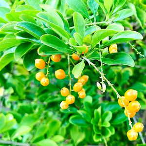 "黄金の露のしずく(ゴールデン・ドロップ)"という素敵な異名を持つ、「台湾連翹(タイワンレンギョウ)の実」でおはようございます🍃🍊🍃 "タイワンレンギョウ"の実は、北アメリカ南部からブラジル、西インド諸島などの熱帯・亜熱帯地域原産のクマツヅラ科の亜熱帯性の植物🇧🇷 実が熟して色づいた頃合いを見極めたように、枝から枝へと飛び渡る鳥達がせっせと食べていますが、実にはサポニンやアルカロイドなどの強い毒性成分が含まれている為、人間やペットが口にしないよう注意が必要です⚠️👀 そもそも、毒性のある成分は種子の周りの果肉や果汁に分泌されていることが多いですが、ヒヨドリやツグミなどの多くの鳥は、口に収まる果実を噛まずに丸呑みする為、噛み潰して食べる人間等の哺乳類と異なり、植物に含まれる有毒成分を体内に吸収しにくいという特性があるようですね。 また、植物の方も種子を運んでもらう為に、種子そのものが消化されないように進化していて、鳥が種子をそのまま糞として排出するため、毒成分は種子に入っていても、鳥の体内での代謝・吸収の対象になりにくい構造があること等も、お調べして分かりました🍃🦜✨ ー別名は、「デュランタ」、「ハリマツリ」。 ー花言葉は、「あなたを見守る」、「歓迎」…他。