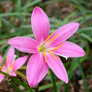 【サフランモドキ(ゼフィランサス、レインリリー)】 中央アメリカ原産、ヒガンバナ科多年草 地下に鱗茎と呼ばれる球根のようなものがあり、そこから花茎が1本伸びて、先端に径6cmほどの花を1個咲かせる。 花は、外花被片(萼に相当)、内花被片(花弁に相当)それぞれ3枚ずつの6枚からなり、鮮やかな桃色をしている。 雄しべは6本で黄色の細長い葯を持つ。真っ白な雌しべは1本で、柱頭は3裂する。 雨の降った後に開花することが多いので、レインリリーと呼ばれる。 「サフラン」と「サフランモドキ」の見た目は似ているが、サフランには鮮やかな赤い雄しべがある。 草丈:20~30cm 花期:6月~10月 花色:ピンク ときわ公園@宇部市