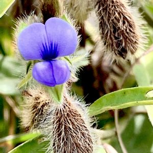 タヌキマメ(狸豆) *マメ科タヌキマメ属 花期は7〜9月 東北南部以南の日当たりの良い湿った草原に生える一年草! 高さは30〜60cm 葉は無柄で互生し線形〜狭長卵形! (マメ科では珍しい1小葉) 花は茎頂に総状花序を出し青紫色の蝶形花で午後に開花して夕方にしぼむ! ①③ 花の上の萼は狸と言うより猫の耳? ⑤果実色々! 花後は萼は閉じて豆果が育つのを守り 完熟すると大きく2つに割れ クルリと巻いて種を飛ばす! A〜Fへと進みます! 狸の毛皮(萼)はずっと残ります❗️ 午前中に場所を確認して昼過ぎに行くと、しっかりと花が咲いていて驚きました‼️ 10月8日撮影 千葉県 山武市