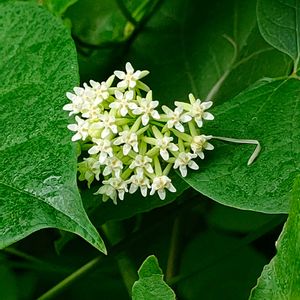 イケマ 🌱キョウチクトウ科 ガガイモ属 ✽つる性の多年草で茎は他の物に絡んで伸び、切ると白い乳液が出る ✽対生する葉は長心形で先がとがる ✽花は長い柄の先にまとまってつき、花冠は5深裂して径約1cm ✽裂片は淡黄緑色で外に反り返り、内側の白い副花冠裂片が直立〜平開する ✽5個の雄しべは雌しべと合着してずい柱となっている 咲き始めていました♪ 葉っぱも可愛いですよね~💚