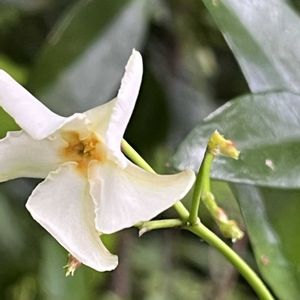 テイカカズラ キョウチクトウ科テイカカズラ属のつる性常緑低木 花期 5〜6月 プロペラ状の花を咲かせる ジャスミンに似た香りがある 果期 10月 20cmの細長い袋果 全体像を撮り忘れてしまいました
