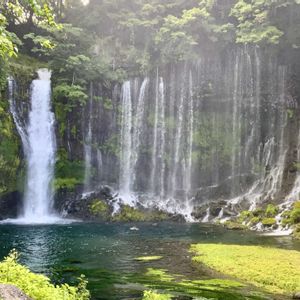 番外編です٩(๑❛ᴗ❛๑)۶ 白糸ノ滝を見に行ってきましたo(^▽^)o💦💦🩵🩵🩵💦💦💦 涼しさのプレゼント🎁です ٩(๑❛ᴗ❛๑)۶💙💝 ◎ 白糸ノ滝 2013年には富士山の構成資産として世界遺産登録されました。 天下の名瀑ですね。 富士山の雪解け水が、上部の水を通す地層である新富士火山層と下部の水を通さない地層である古富士火山層の境の絶壁から湧き出しています。 高さ20m・幅150mの湾曲した絶壁から、大小数百の滝が流れ落ちています。 その姿は白糸の名にふさわしく、幾筋もの絹糸をさらしているようです。 優しく、女性的な美しさで、滝壺近くに立つと、三方が水のアーチとなって幻想的な世界を見せてくれます。 国の名勝及び天然記念物。(平成2年日本の滝百選に選定) ◉白糸ノ滝の歴史 昭和11年、国の名勝及び天然記念物に指定され、昭和25年10月には「観光百選滝の部」で1位に選ばれ、古くからその見事な眺めが人々に愛されている滝です。 ◉白糸ノ滝 幅150mの湾曲した絶壁の全面にかかる白糸ノ滝は、本滝の一部を除いてそのほとんどが富士山の湧水。 岩壁の間から白い絹糸のように流れるさまは、白糸の名にふさわしく、女性的な美しさと、やさしい景観を見せながら周囲にキリリと冷えた風を運んでいます。 年間を通じて水温12℃、毎秒1.5トンの湧水が流れ出ているといわれています。 とってもとっても涼しくて空気も良く楽しい一時を過ごせましたo(^▽^)o🩵💙