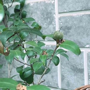 山茶花に実が付いていました! 小さめの鉢植えのままなので、植え替えてあげなくちゃ駄目かしら?