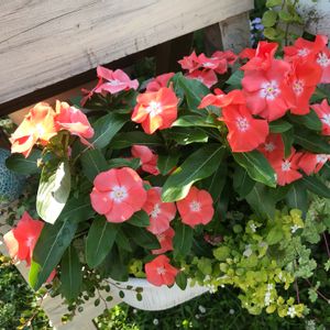 一歳の末っ子息子君と植えた寄せ植え♡ インパチェンスと日々草夏みかん アルテルナンテラレッドフラッシュ