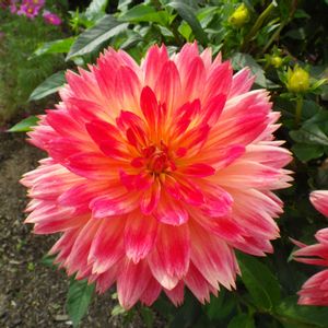 デーハー✨なダリア「ペチカ」 咲き進むと少し褪色するのだけど 咲き始めはギャン‼️って感じで ああ、だから「ペチカ🔥」なのね って納得 支柱がぶさいく