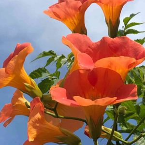 8月は葉月(はづき/はつき)、木々の葉落ちの月(はおちづき)とされる。 これは旧暦、現在でも使用されることもあるが、現行歴とはその1〜2月後位の季節感のずれがあるという。 最近、年毎に熱さ日の中に暑さも募るようであるが、私の散歩道の道際等の草花達は、その熱い陽の中にあっても、己が自身を一生懸命に、最大限に自己表現に向けようとしているようだ。 7月からの、熱い夏へ、夏の草花達の姿 ---その12。 /観るは熱暑の中に漏斗状花、 花顔寄せ合うように幾つかが/ すでに8月は中旬。この厳夏、熱暑の中での久しぶりの何時ものオープンガーデン。 そこには、今年も出会い観るは、少し距離を置いてのその黄橙色に見える花たちの風景。近づいて観る。 それは、耐え難きにも耐えているように熱暑の中に、あの一種華麗なツル性の花木の花たちが、伸びたツルの先に円錐の花序を出し、花径7〜8cmほどの花を幾つかを咲かせていた。 そして、幾つかのその花顔(漏斗形で先が5裂し平らに開いた)を、1箇所に寄せ合うようにもしていた。 しばらくして、散歩者は、汗を拭いてそこを後にした。 その花は、一輪一輪の花は短命であるが、花期の間、花は次々と開花するという。 ノウゼンカズラ(凌霄花) <‘ノウゼンカズラの花名’ について、下記の「ノウゼンカズラ」より抜粋、次に: 日本には平安時代に渡来したとされている。 平安時代の漢和薬名辞典である『本草和名』に、「乃宇世宇(ノウセウ)」の記載がある。 「乃宇世宇」というのはノウゼンカズラの古名で、「ノウセウ」または「ノセウ」が訛って「ノウゼン」と呼ばれるようになったと言われている。> ・ノウゼンカズラ<凌霄花>(ノウゼンカズラ科 ノウゼンカズラ属) (備忘: ノウゼンカズラの属性等について 6/20or6/21 ‘21) 上記の“ノウゼンカズラ”の属性等は、今後下記の「ノウゼンカズラ」の属性等が取り替わる。 ↓ ・ノウゼンカズラ<凌霄花>(ノウゼンカズラ科 ノウゼンカズラ属) 中国原産の落葉つる性植物。 (夏から秋にかけ橙色あるいは赤色の大きな美しい花をつけ、気根を出して樹木や壁などの他物に付着してつるを伸ばす。)* つるは3~10mに伸び、他のものに付着する気根を出して木や壁を這い上る。 *( )内、旧出典先から引用追加 日本には平安時代に渡来したとされている。 平安時代の漢和薬名辞典である『本草和名』に、「乃宇世宇(ノウセウ)」の記載がある。 「乃宇世宇」というのはノウゼンカズラの古名で、「ノウセウ」または「ノセウ」が訛って「ノウゼン」と呼ばれるようになったと言われている。 ノウゼンカズラ属は本種ノウゼンカズラと、アメリカ南東部原産のアメリカノウゼンカズラの2種からなり、これらの交雑種である園芸品種も流通している。 ノウゼンカズラの花期は7月~8月。 花期になると、伸びたツルの先に花序を出し花を咲かせる。 花序は円錐形で枝垂れる。 花は直径6~7㎝の漏斗形で、先が5裂している。 雄しべは4個、雌しべは1個。 雌しべの柱頭は2裂している。 一輪一輪の花は短命であるが、花期の間、花は次々と開花する。 葉は対生し、羽状複葉(うじょうふくよう)で2~6対の小葉が付く。 羽状複葉(うじょうふくよう)とは、葉軸の左右に小葉が並んだもの。 羽状複葉が集まってさらに大きな羽状複葉を構成している場合、その回数に合わせて2回羽状複葉、3回羽状複葉と呼ぶ。 小葉は先がとがった卵形で、縁に粗い鋸歯がある。 つるは気根を出し他のものに絡みながら長さ3~10m程度に成長する。 耐寒性、耐暑性共に高く、東北地方以南であれば植栽可能である。 生育旺盛で花付きも良く、育てやすい花木である。 <ノウゼンカズラの主な品種、近縁種> →アメリカノウゼンカズラ アメリカ南東部原産のノウゼンカズラの近縁種。 美しい花を咲かせることから観賞用として栽培されており、現在では逸出したものがアメリカの多くの地域、ヨーロッパなどでも帰化状態にある。 ノウゼンカズラに比べると花序が短いため、花がまとまって付く。 花色は赤みが強いオレンジで、花はやや小さく、花筒が長いのが特徴。 →アメリカノウゼンカズラ ‘フラバ’ アメリカノウゼンカズラの園芸品種で、黄色の花を咲かせる。 →アイノコノウゼンカズラ ノウゼンカズラとアメリカノウゼンカズラの交配による園芸品種。 赤に近いオレンジの花を咲かせる。 数多くの品種がある。 →タカラヅカシリーズ 兵庫県宝塚市で生産されたノウゼンカズラ。 黄花品種の‘タカラヅカ・ゴールド’、濃いオレンジ花の‘オランジュ・タカラヅカ’などが有名。 やや小型の品種が多く、鉢植えでも育てることが可能。 (出典・参考: ガーデニングの図鑑)