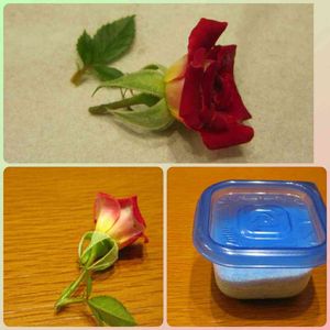 夕方摘んだリトルアーチスト🌹 1つは水に生け、1つは先ほどドライフラワー作成。 今回は3枚葉も。 水に生けたほうも、もう少し咲き進んだらドライフラワーにしたいです😃