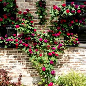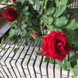 出先のレストランのバラ🌹 微妙にニュアンスの違う赤色2種類が植えてあるのか、渋カッコいい⤴ この時期、華やかでゴージャスなバラ植栽が多いけど、大人っぽいのも素敵🌹