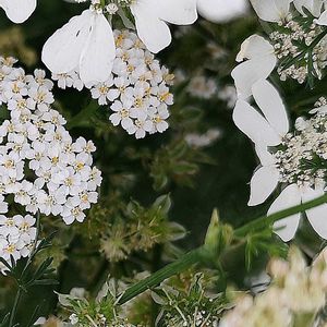 白色の花❁ 西側 出窓下花壇より ⬅️左端❁🤍アキレア(ノコギリソウ) (❁2~3㍉の花の集合体) ❁🤍オルレア ⤵️は、オルレアの花後 (ボケてます😅🙇♀)