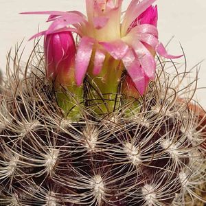 Eriosyce nidus 和名 銀翁丸 別名 ニドゥス またいい感じに開花してくれました。旧ネオポルテリア属 で今は エリオシケ属 ホムセンなんかでも良く見かける唯一のネオポルと言っても過言ではないほど良く見かけます これをとことん こだわって 育てる😊👍 これが めちゃ楽しい🌸🌸🌸 でも この棘は 細くて 硬くて1番痛い🥲💦