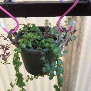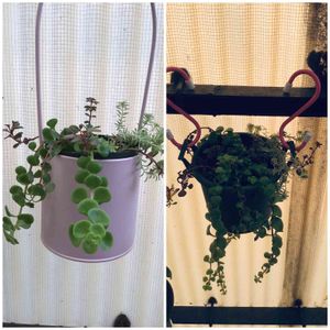 こんばんは🙇 ロボ缶鉢🤖 強風で飛んでいってましたが😅 凹み治して⚒️ 余りセダムと、この前お迎えしたセダム達をブチ込んで😁 チェン付けて吊り下げ完成‼️
