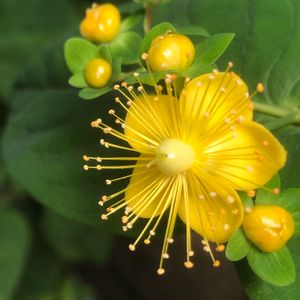 🌼ヒペリカム・小坊主弟切💛 このお花も花友から頂いたのよ🌼 さぁ?5〜6年経つのかなぁ? 今年は、万作!✌️😄❣️ ヤット落ち着いてくれた様ね。 枝毎にまん丸い蕾とパッチリ まつ毛がとっても可愛いなぁ😄 美人ちゃんですね😄👏💖